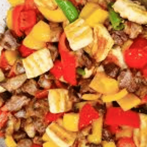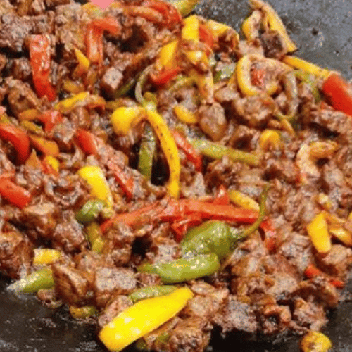 نحضّر هذا الطبق باستخدام قطع لحم طازجة يتم تتبيلها بعناية بتوابل شرقية غنية تُبرز طعمها الطبيعي، ثم تُطهى على الصاج الساخن مع البصل والفلفل الطازج لتتمازج النكهات وتُطلق رائحة شهية لا تُقاوم.