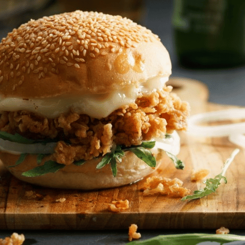 نحضّر هذا الطبق باستخدام صدور دجاج طازجة يتم تتبيلها بعناية لتكتسب نكهة مميزة من الداخل، ثم تُغطّى بطبقة مقرمشة ذهبية وتُقلى بإتقان للحصول على قوام مثالي يجمع بين القرمشة الخارجية والطراوة العصارية من الداخل.